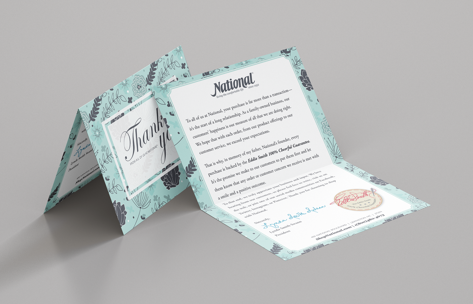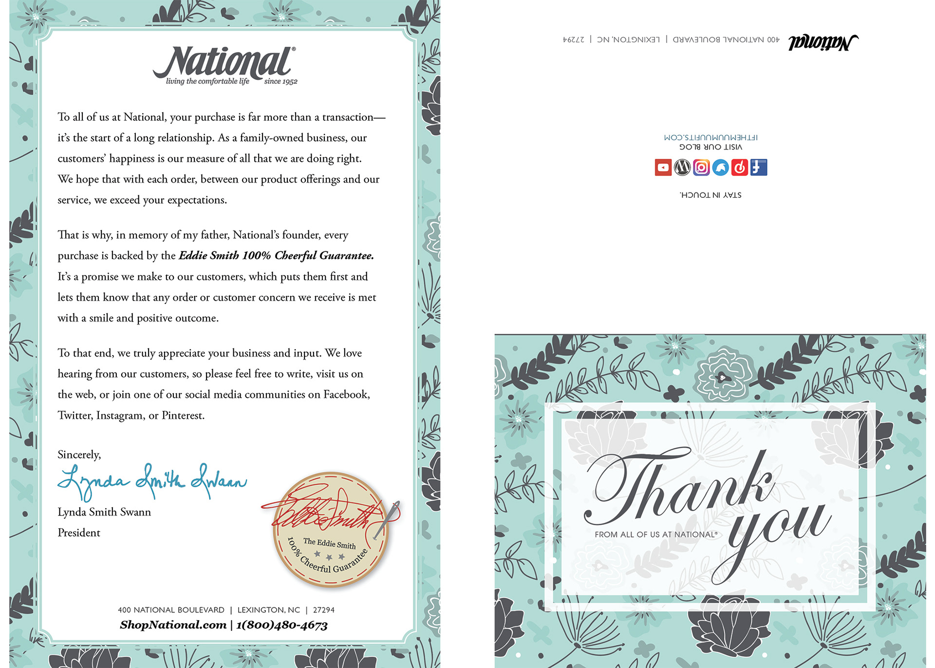 The National Thank you card is a personal message from the CEO Lynda Swann to thank every order that is sent out from National.